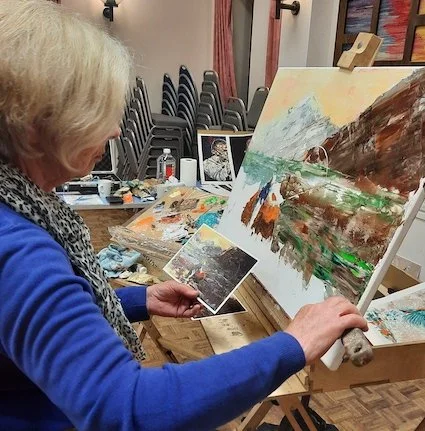 For his workshop, Michael explained that as he wanted all the participants to come away with a successful picture and a confident grasp of the palette knife techniques, he would provide a picture to use as a reference, assist everyone to make a simple outline on their surface and then encourage them to enjoy practising their skills.